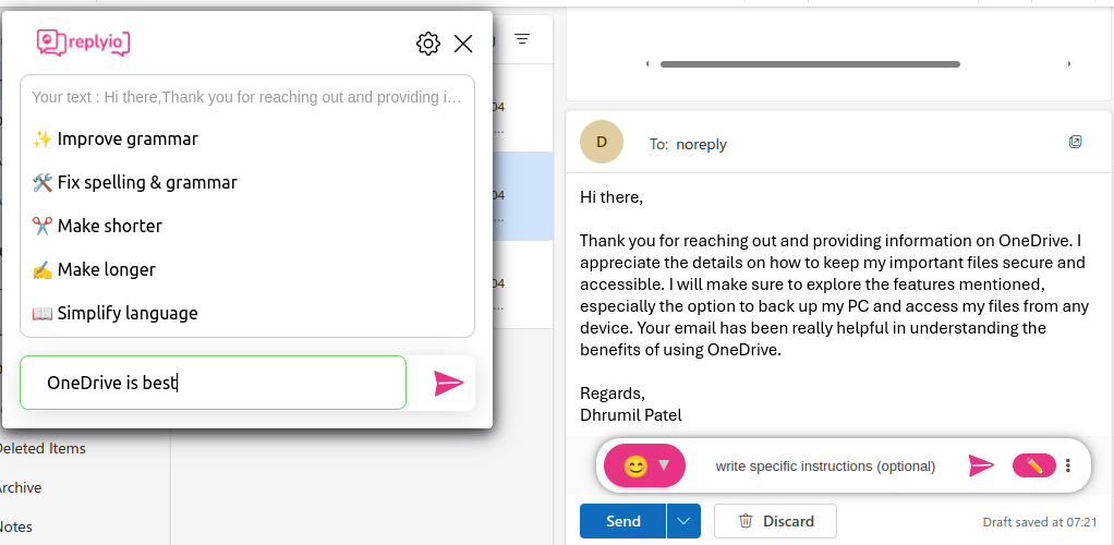 When you click on the 'Reply' button, you'll see the Replyio populated screen, where you can add instructions if needed. Then, click on the 'Generate' button to create a reply for the email.
