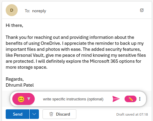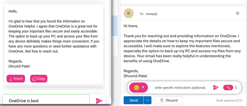 Once you receive a reply, it will be automatically inserted into the text area. You can then simply click the send button to send the email.