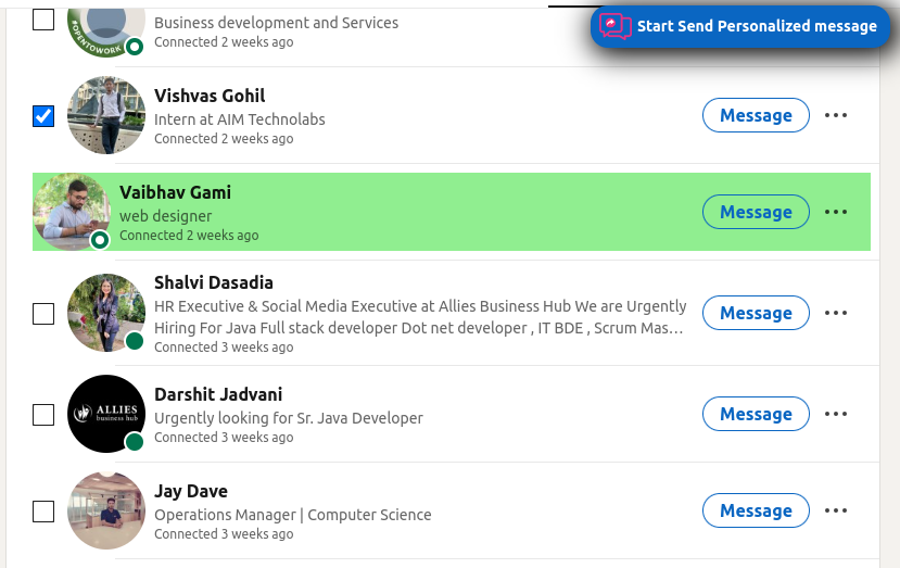 When you arrive on this page, you will see a checkbox in front of each connection, and you can decide to whom you want to send a message.